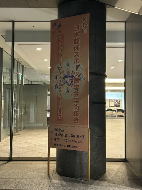 11月2日、3日に幕張メッセにて開催された第36回日本臨床スポーツ医学会学術集会に参加いたしましたのでご報告させていただきます。本学会は、スポーツ整形外科、運動器リハビリテーション、理学療法、チームドクター活動、トレーニング科学など、スポーツ医学に関わる多職種の専門家が一堂に会し、最新の知見と臨床経験を共有する学術集会です。今回の学会のテーマは「ライフパフォーマンスを高めるスポーツ医学」とのことでエリートアスリートのみを対象にするのではなく幅広くスポーツ医学に関して知見を広められるようなプログラムが多く組まれていました。参加者は整形外科だけではなく、総合診療科、産婦人科の医師、歯科医師、薬剤師、看護師、PT、AT、学生等とても幅広い職種にわたっており、会場全体が活気に満ち溢れていました。